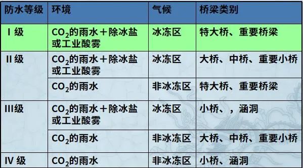 桥梁所处环境的气候不同,水对桥梁结构的侵蚀和对铺装的破坏也不同,对桥面铺装的防水性能要求也不同。