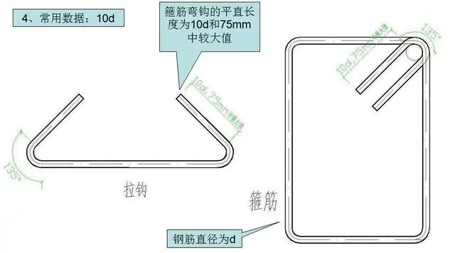 1)10d;≥75mm:抗震要求时所有的箍筋、拉钩弯钩的平直长度。