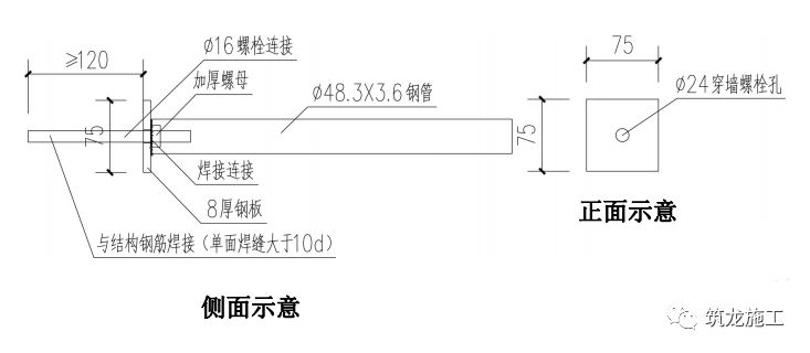 2. 混凝土浇筑前将预埋件埋入剪力墙或梁内(或设置穿墙螺栓孔),刚性连接件焊接螺母的一端套入预埋件(或穿墙螺栓),另一端通过扣件与脚手架立杆固定