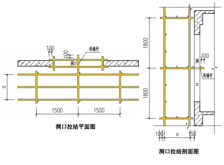 架体小横杆延长作为连墙杆,a为800 mm或1050 mm(悬挑式脚手架为800 mm,落地式脚手架为1050 mm),连墙杆外露洞口≥100 mm。在连墙杆上,内外墙各附加一根钢管,用扣件连接,小横杆两端分别外露洞口各≥100 mm。进入装修阶段,墙体需加设成品保护
