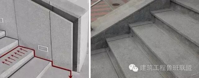 建筑工程室外台阶内侧设排水沟槽,水从小槽排至台阶两边后集中排至地面,以防行人上下滑倒