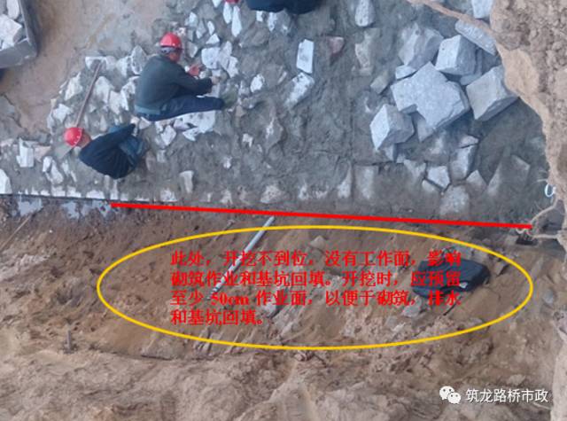 6 当开挖至距基底标高30cm左右时,应采用人工开挖,以保证基底标高和基底平整度,严禁超挖,如有超挖要请示监理工程师,以确定合适的处理方法,在此过程中,测量人员要勤测标高,以便指挥挖掘机下挖深度,避免基底开挖的凸凹不平。