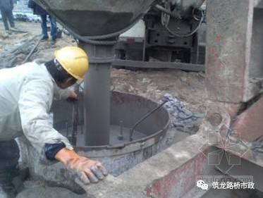 在灌注接近结束时,由于导管混凝土柱高度减小,压力降低,而导管管外的泥浆稠度增加,如出现混凝土面上升困难时,可在孔内加水稀释泥浆,并掏出部分沉淀土,使灌注工作顺利进行