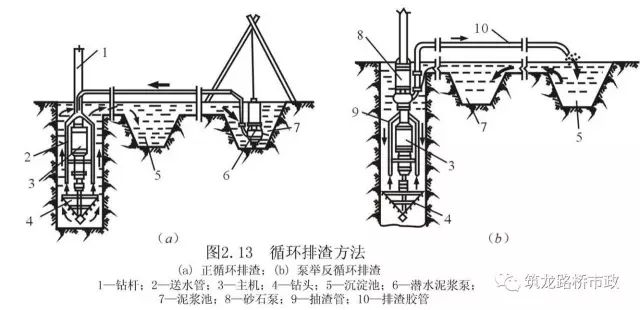 正循环是用泥浆泵将泥浆以一定压力通过空心钻杆顶部,从钻杆底部喷出,底部的钻锥在旋转时将土壤搅松成为钻渣,被泥浆悬浮,随泥浆上升而溢出流至孔外的泥浆槽,经过沉淀池中沉淀净化,再循环使用。