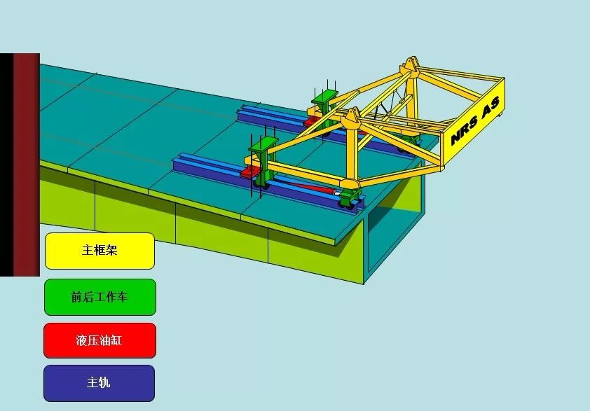 挂篮锚固悬挂在已施工梁段上,为下一节段施工作业提供空中平台。完成一个节段施工后,挂篮即可前移并固定,进行下一节段的施工,如此循环直至悬臂灌注完成。