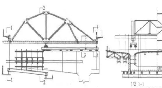 前后横梁、底模纵梁可根据具体情况为型钢式或桁架式。