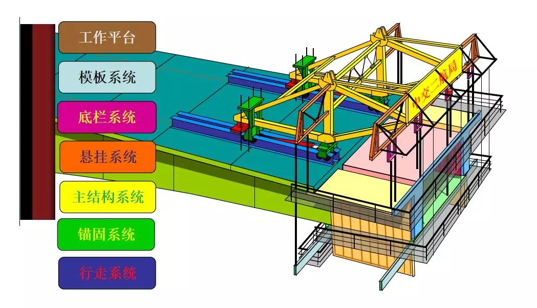 挂篮主要由承重结构、吊挂系统、走行系统与模板系统等组成 ,各部自成体系,相互独立且又相互联系。