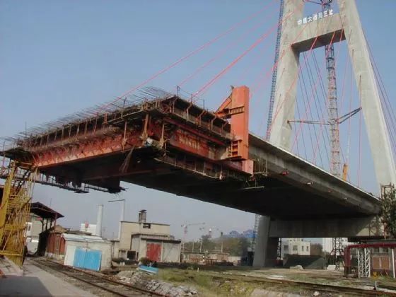 前支点挂篮(多用于斜拉桥施工,因为节段长度较大,一般挂篮难以达到悬臂刚度。有现成的斜拉索可以利用,作为挂篮的前支点。)