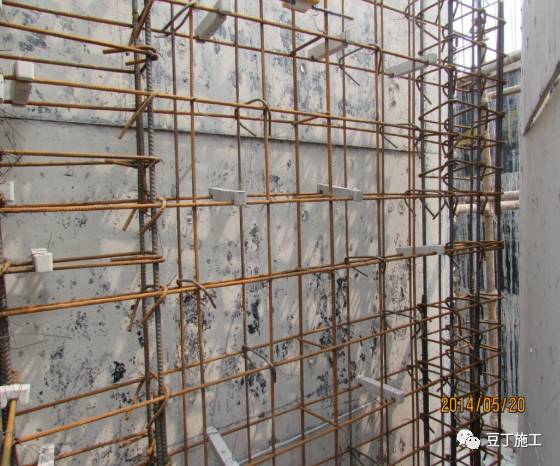 D、钢筋定位:墙体竖向梯子筋:间距1.2m布置,可代替墙体竖向钢筋,但要比设计直径大一规格;水平梯子筋:控制立筋间距及位置,设置一道水平梯子筋,距板高度不大于300mm, 作为上层定位筋周转使用 ;双F卡、塑料垫块:控制墙体钢筋截面及钢筋保护层厚度,双F卡间距800mm梅花形布置且必须与钢筋绑扎牢固,塑料垫块间距400mm梅花形布置,墙钢筋间距不得大于10mm,保护层厚度偏差不得超过±5mm。