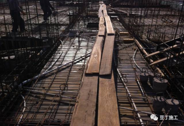 顶板砼浇筑时应对钢筋采取保护措施,以防踩踏变形,如使用钢管跳板搭设临时通道、在钢筋网上铺设木跳板、设置成品马凳等;浇筑时指派专人监管,及时对变形移位的钢筋进行恢复。