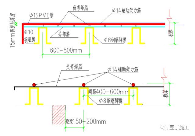 架立筋采用Φ14钢筋穿Φ15PVC管作为辅助架立筋(间距400-600mm),将板的负弯矩钢筋临时悬挂固定于辅助架立筋下,使负弯矩钢筋、辅助架立筋、分布筋和撑脚连成整体(如图),从而构成刚度较大的钢筋网片,能承受一定的冲击力和偶尔的人工踩踏,避免混凝土浇捣过程造成负弯矩筋的严重偏位、下陷和严重变形情况,同时在辅助架力筋两端焊接Φ10钢筋脚,使脚底到架力筋顶面高度为楼板厚度(如开间较大,考虑架立筋起拱)