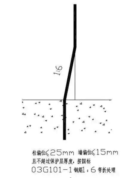 如果钢筋位移在 25mm 到 50mm 之间且向内偏,可直接在楼面上按 1:6 比例调整钢筋,保证模板支设,同时采取钢筋根部绑扎和点焊钢筋的方法进行加固,加筋的直径为 14,加筋需要与打弯的钢筋绑扎搭接在一起。