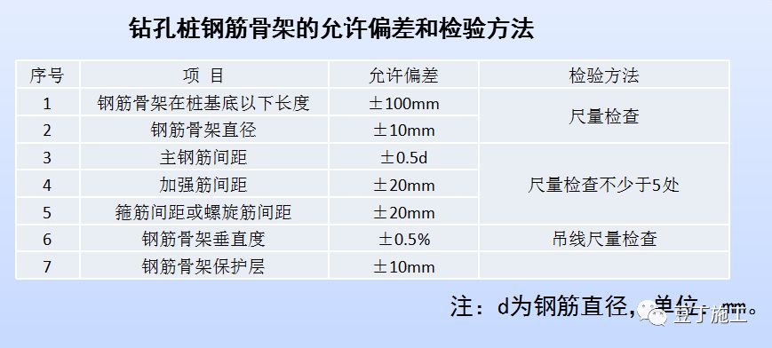 ⑴ 钢筋应平直、无损伤,表面无裂纹、油污、颗粒状或片状老锈。钻孔桩钢筋骨架的允许偏差和检验方法应下表规定: