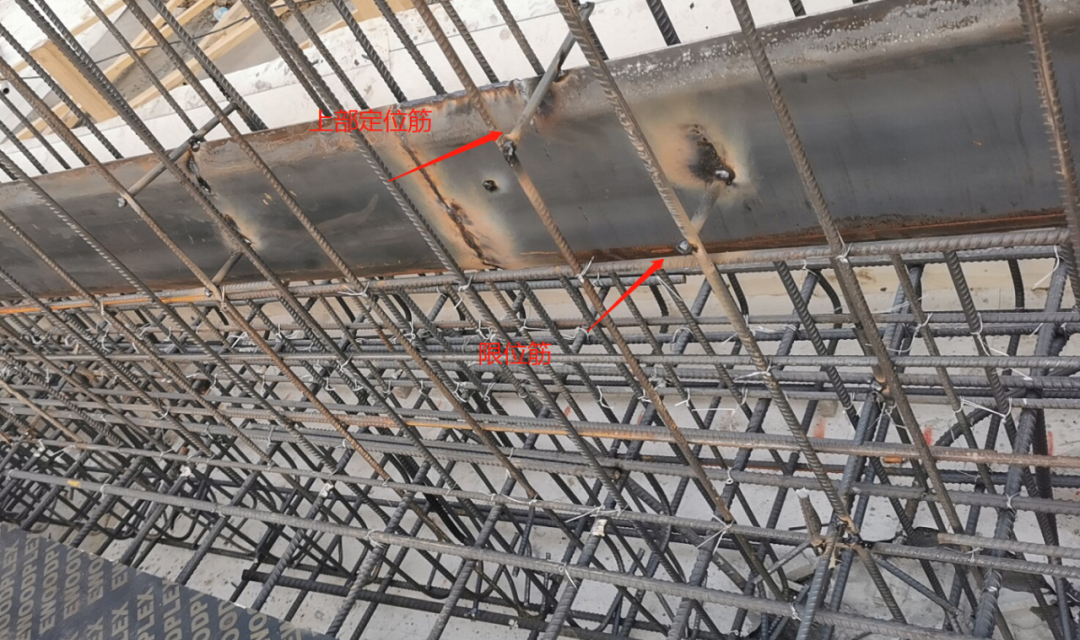 (3)钢板固定措施:钢板就位调整好垂直度后将上口点焊在水平定位筋,并将中部限位筋(原已焊牢在钢板上)与外墙立筋点焊牢固,现场采用φ12@600。