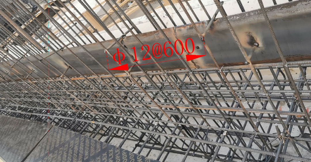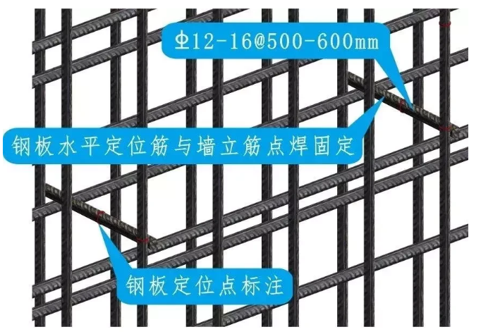 (3)钢板固定措施:钢板就位调整好垂直度后将上口点焊在水平定位筋,并将中部限位筋(原已焊牢在钢板上)与外墙立筋点焊牢固,现场采用φ12@600。