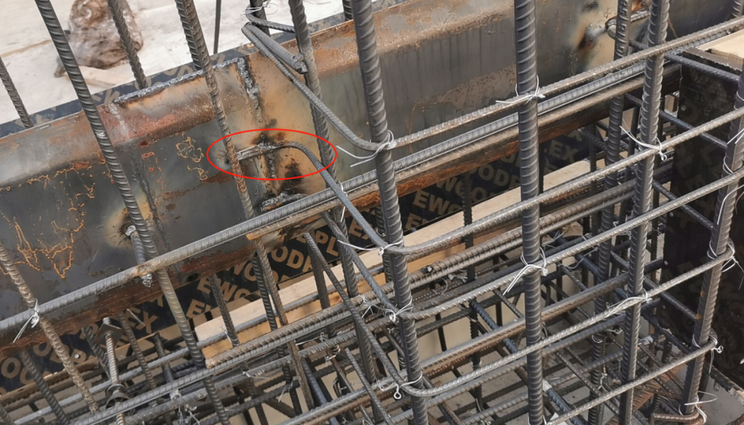 (4)钢板穿柱节点:本工程止水钢板穿柱子处,柱箍筋采用开口箍形式,并与止水钢板双面搭接焊,焊接长度为5d(5*10=50mm)。