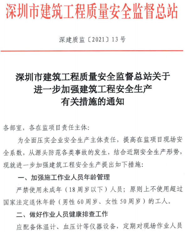 5月31日,深圳市质安总站发布了关于进一步加强建筑工程安全生产有关措施的通知。