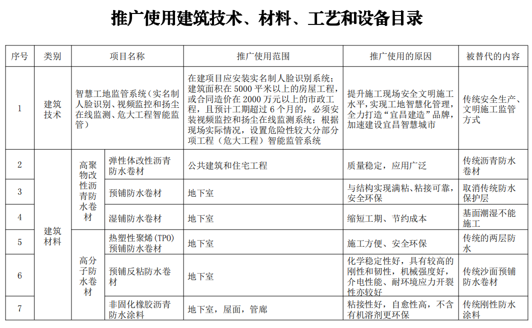 为提高我市建设工程质量和安全生产管理水平,促进建设业高质量发展,现公布《宜昌市建设工程推广、限制和禁止使用建筑技术、材料、工艺和设备目录(第一批)》。