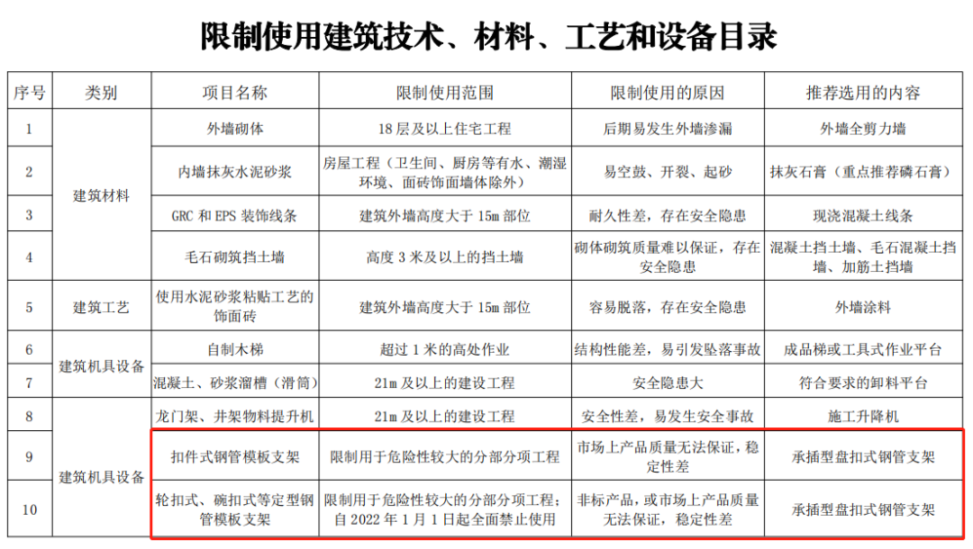 在重庆市最新发布的《重庆市建设领域禁止、限制使用落后技术通告(2019年版)》,也对扣件式钢管脚手架的使用作了限制。