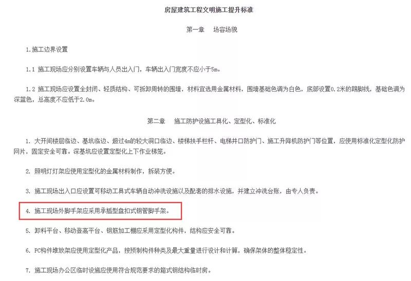 根据上海市住房和城乡建设管理委员会关于印发《房屋建筑工程文明施工提升标准》的通知:为了满足“施工防护设施工具化、定型化、标准化”的要求,自2019年10月1日起,上海市内工程项目应采用承插型盘扣式钢管脚手架