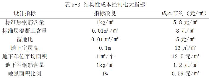如,根据标杆房企的经验及笔者所参与项目的实际情况,设计阶段对结构性成本主要关注钢筋与混凝土含量,窗地比、地下室层高等指标,其中每一项的优化和改良,都会带来明显的成本节约,如表5-3所示。