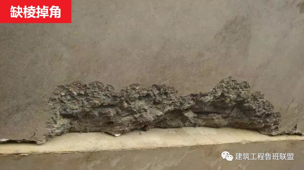 现象:梁、柱、板、墙和洞口直角处砼局部掉落,不规整,棱角有缺陷。