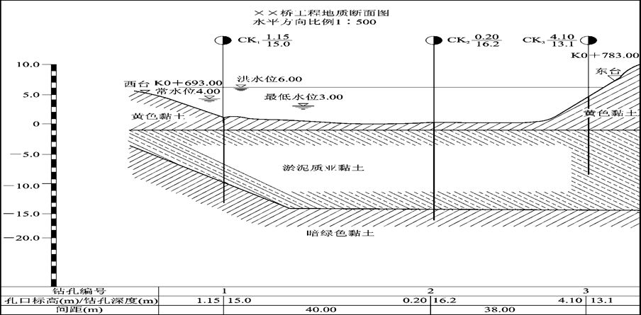 桥位地质断面图是根据水文调查和地质钻探所得的资料,绘制的河床地质断面图,用以表示桥梁所在位置的地质水文情况,包括河床断面线、地质分界线,特殊水位线(最高水位、常水位和最低水位)。如图11-7所示。