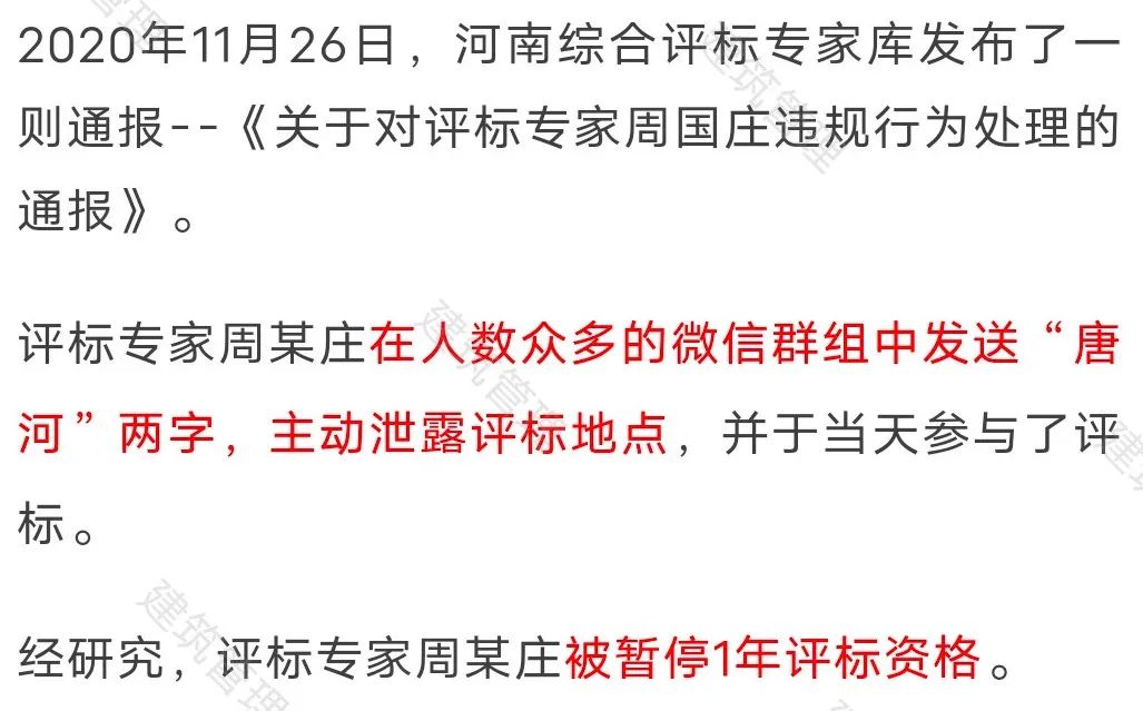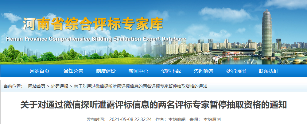 此前,河南省发布通知,接到举报发现两起河南省综合评标专家库评标专家通过微信群探听、泄露评标信息的行为。经调查,对这两名专家予以暂停六个月和十二个月抽取资格。