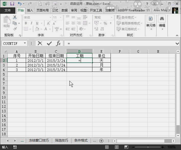 笔者先简单解释下以下表格中的单元格D2输入的公式“=DATEDIF(B2,C2,"d")“前两个参数分别是开始日期和结束日期,第三个参数"d"是计算天数的参数,也可以改成"m"(计算月份)和"y"(计算年份)。