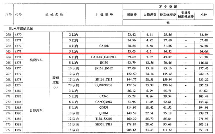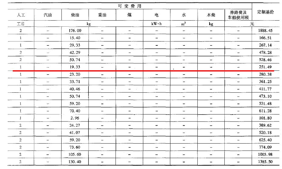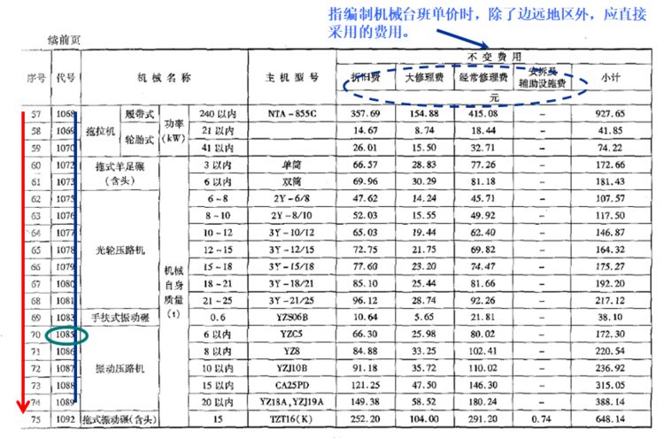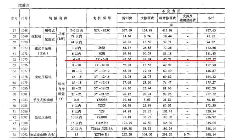 1、时间定额:1台班相当于1台机械工作8h的劳动量。其中潜水设备每台班按6h计算,变压器和配电设备每台班按24h计算。公路工程机械台班费用定额:2008年1月1日交通部颁布执行。1、定义:以一个台班为单位,规定其所消耗的工时、燃料、费用等数量标准。2、分类(共11大类,746个子目):土石方工程机械、路面工程机械、混凝土及灰浆机械、水平运输机械、起重及垂直运输机械、打桩、钻孔机械、泵类机械、金属、木、石料加工机械、动力机械、工程机械、其他机械等。1、折旧费:机械设备在规定使用期限内陆续收回其原值的费用。2、大修理费:机械设备按规定的大维修间隔台班必须进行大维修,以恢复正常功能所需费用。3、经常维修费:机械设备除大维修以外的各级保养及为排除临时故障所需费用;为保障机械正常运转所需替换设备、随机使用工具、附具摊销和维护的费用;机械运转与日常保养所需的润滑油脂、擦拭材料(布及棉纱等)费用和机械在规定年工作台班以外的维护、保养费用等。4、安装拆卸及辅助设施费包括安置机械的基础、底座及固定锚桩等费用。打桩、钻孔机械在施工过程中的过墩、移位等所发生的安装及拆卸费包括在工程项目费用之内;稳定土厂拌和设备、沥青乳化设备、黑色粒料拌和设备、沥青混合料拌和设备、混凝土搅拌站、塔式起重机、施工电梯的安装、拆卸以及拌和设备、大型发电机的混凝土基础、沉淀池、散热池等辅助设施和机械所需的轨道、工作台的设置费用不在此项费用内,在工程项目中另行计算。(2)可变费用:其费用随当地物价水平而变化的费用。构成可变费用的资源主要有人工、燃料、水、电、养路费及车船使用税等。在计算台班单价时,随机操作人员数量及动力、物资消耗量应以定额中的数值为准,工资标准按《编制办法》的规定执行,工程船舶和潜水设备的工日单价按当地有关部门规定计算。动力燃料按当地动力物资的工地预算价格计算;养路费及车船使用税,如需缴纳时,就按各省、自治区、直辖市及国务院有关部门规定的标准,按机械的年工作台班计入台班费中。基价是不变费用和可变费用的合计数。其中不变费用是按定额规定编制的,可变费用中的人工费、动力燃料费按下表预算价格计算。