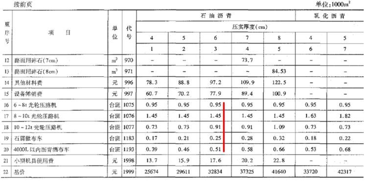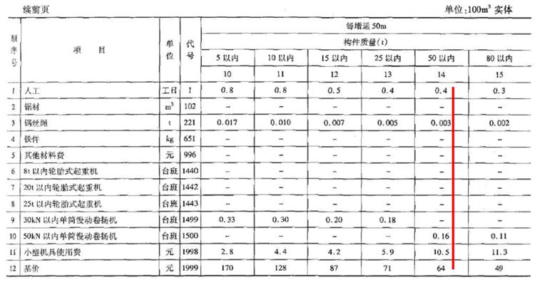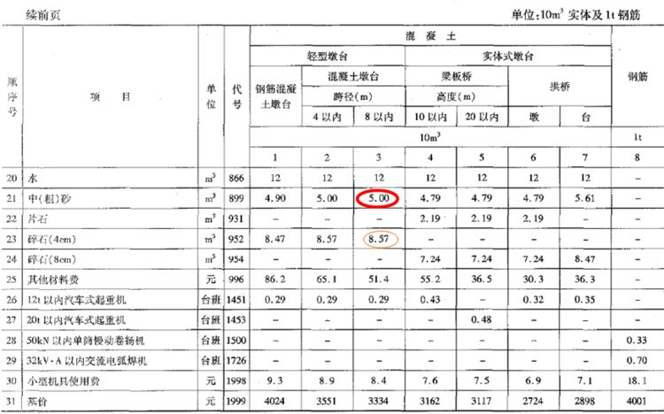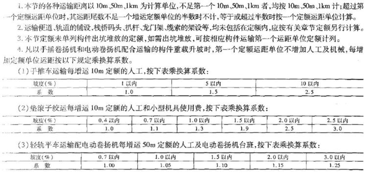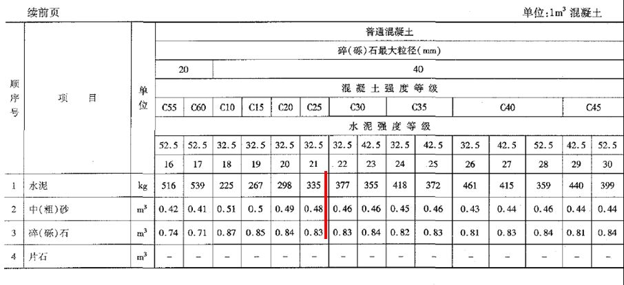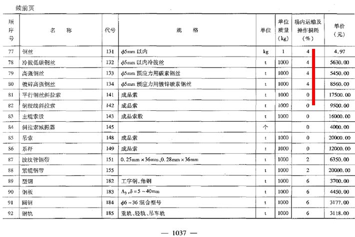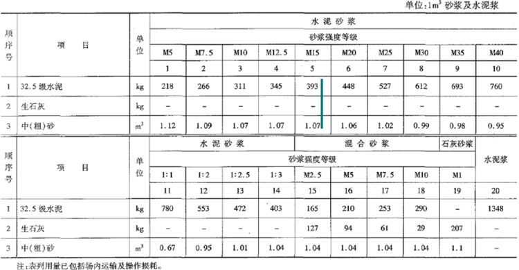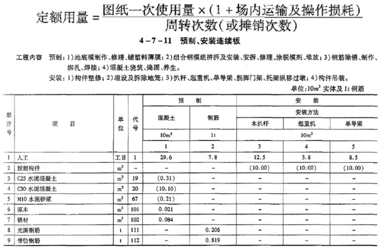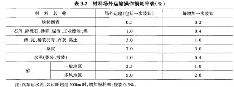 2、场内运输及操作损耗:材料消耗定额中考虑,其定额值“场内运输及操作损耗”是以百分率形式在《预算定额》附录四中体现。材料消耗定额:在节约和合理使用材料的条件下,生产单位合格产品所必须消耗的一定品种规格的材料、半成品、配件、水、电、燃料等数量标准,包括材料的净用量和必要的工艺性损耗及废料数量。计量单位以材料的实物量单位表示,如t、kg、m3。材料消耗定额=(1+材料场内运输及操作损耗率)*完成单位产品的材料净消耗32.5级水泥=0.406*(1+1%)*10=4.101t