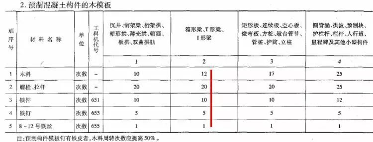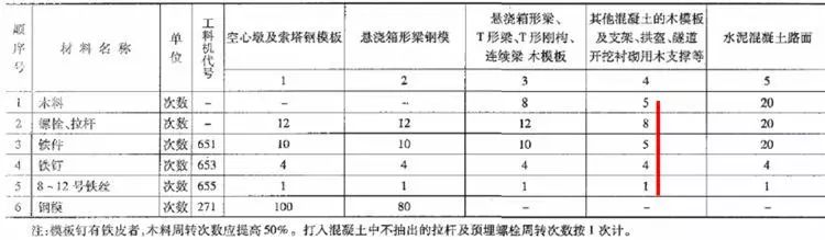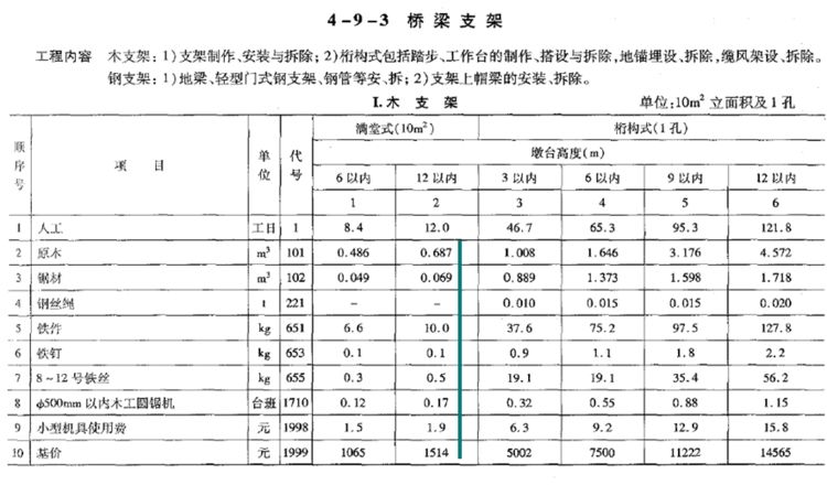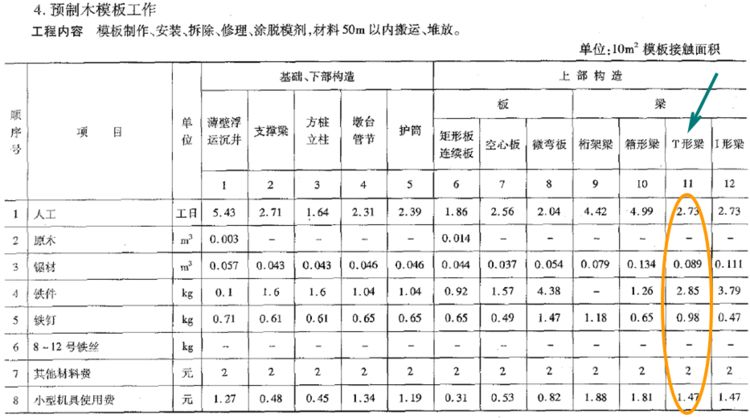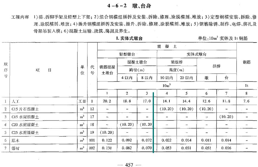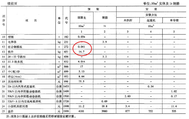 中(粗)砂=0.46*(1+1%)*10=4.65m3材料基本定额合理条件下,为生产单位数量半产品、中间产品所规定的各种基本原材料的(工、料、机、费用等)消耗量标准。1)分析分项工程或半成品所需人工、材料、机械的消耗量。某跨径为6m的实体式轻型墩台,混凝土设计强度等级为C25,试确定混凝土组成材料的预算定额。32.5级水泥=0.335*10.2=3.417t(3.040t)中砂=0.48*10.2=4.90m3(5.00m3)碎石(100px)=0.83*10.2=8.47m3(8.57m3)预制某矩形板,跨径为8m,砂浆设计强度等级为M15,试确定水泥混凝土及砂浆组成材料的预算定额。水泥:0.377*10.10+0.37*0.393=3.953t(3.927t)中(粗)砂=0.46*10.10+1.07*0.37=4.8m3(5.04m3)材料周转定额规定了周转性材料在施工中合理使用的周转或摊销的次数。定额用量是指周转性材料每周转使用一次应承担的摊销数量。《预算定额》总说明第八条规定:“本定额中周转性的材料、模板、支撑、脚手杆、脚手板和档土板等的数量,已考虑了材料的正常周转次数并计入定额内。其中就地浇筑钢筋混凝土梁用的支架及拱圈、支架,如确因施工安排达不到规定的周转次数时,可根据具体情况进行换算并按规定计算回收,其余工程一般不予抽换。抽换方法:实际定额用量=图纸一次用量(1+场内运输及操作损耗)/实际周转次数(或摊销次数)某3孔现浇钢筋混凝土梁用满堂式木支架一套,墩台高10m。试确定其实际周转次数的实际定额用量。机械台班消耗定额:在正常施工条件下,合理组织和利用某种机械完成单位合格产品所必需机械台班消耗标准,或在单位时间内机械完成的产品数量。