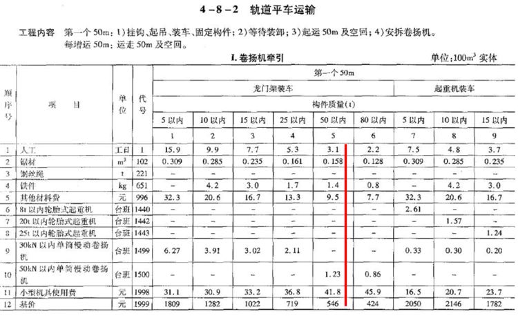 已知柴油4.8元/kg,试计算6-8t光轮压路机台班单价。查表,机械代号1075,其中不变费用为107.57元,可变费用中人工费1*49.20=49.20元,柴油费4.8*19.33=92.78元,台班单价=107.57+92.78+49.20=249.55元/台班例7 某工程需5t载货汽车15台班,试求其所需资源的消耗数量。直接工程费:施工过程中用于直接构成工程实体和有助于实体形成的各项费用。它主要由人工费、材料费、机械使用费三部分组成。人工费(材料费、机械使用费)=定额*工程数量*单价例1:浆砌片石护拱[440-4-5-2-2]、浆砌片石护脚[750-5-1-16-2](1)8t以内自卸汽车运路基土5km 【15-1-1-10-9、10】(2)8t以内自卸汽车运土5km【981-9-1-6-37、38】(3)8t以内自卸汽车运输路面混合料5km【160-2-2-13-9、10】(4)8t载货汽车运输预制构件5km【618-4-8-3-5、13】天然密实方与压实方之间存在一定换算关系;其中推土机、铲运机施工土方的增运定额按普通土栏目的系数计算,人工挖运土方的增运定额和机械翻斗车、手扶拖拉机运输土方、自卸汽车运输土方定额在下表基础上增加0.03土方运输损耗,但弃方运输不用计算运输损耗。另外,各类土石方在进行路基土石调配时,其定额、计量单位、计价等是按如下规定进行的。 (1)挖方。按土质分类分别套用相应的定额,定额单位为天然密实方。 (3)本桩利用。不参与费用的计算,其挖已在挖方内计算,其填已在填方内计算。 (4)远用利用。只计算其调配运输费用,其挖已在其他断面的挖方内计算,其填已在填方内计算。 (5)借方。计算其挖、装、运的费用,其填已在填方内计算。 (6)弃方。只计算其运输费用,其挖已在挖方内计算。 某二级公路路基工程需借普通土6000m3实体,请根据《概算定额》确定6t自卸汽车运土4km所需台班数量。(1)天然密实方数量:6000(1.16+0.03)=7140m3《概算定额》【13-1-1-8-5、6】,可知6t自卸汽车运土4km所需的台班数:(13.79+2.04*6)*7140/1000=185.85台班A、各类稳定土基层,级配碎石、砾石路面的压实厚度在375px以内,填隙碎石一层的压实厚度在300px以内,垫层和其他种类的基层压实厚度在500px以内,面层的压实厚度在375px以内,拖拉机、平地机和压路机台班按定额数量计算,如超过以上压实厚度进行分层拌和、碾压时,拖拉机、平地机和压路机台班按定额数量加倍,每1000m2增加3.0工日。B、水泥、石灰稳定类基层定额中的水泥或石灰与其他材料系按一定配合比例编制的,当设计配合比与定额标明的配合比不同时,有关材料可分别按下式换算:某稳定土拌和机拌和石灰粉煤灰砂砾基层,压实厚度为500px,已知石灰、粉煤灰、砂砾设计配合比4:12:84 ,分层拌和,试确定预算定额。生石灰:【15.311+1.021*(20-15)】*(4/5)=16.333t砂砾:【147.03+9.8*(20-15)】*(84/80)=205.83m3粉煤灰:【61.24+4.08*5】*(12/15)=65.312m3某桥预制构件重40t,采用轨道平车运输,卷扬机牵引,龙门架装车运80m,载重升坡0.8%,试确定其预算定额。人工:3.1+0.4*1.05=3.52工日;锯条:0.158m3;铁件:1.4kg50Kn以内单筒慢动卷扬机:1.23+0.16*1.05=1.4台班某预制厂预制T梁,梁长19.96m,梁肋底宽0.18m,翼板宽1.6m,共12个底座,求(1)12片梁底座总面积,(2)12片梁所需蒸汽养生室的建筑面积及所需32.5级水泥的数量。每片梁底面积=(19.96+2)*(0.18+1)=25.91m212片梁底座面积=25.91*12=310.92m2679页第4项规定,蒸汽养生室面积按有效面积计算,其工程量按每一养生室安置两片梁,其梁间距离为0.8m,并按长度每端增加1.5m,宽度每边增加1.0m考虑。故:每2片梁养生室面积=(19.96+2*1.5)*(2*1.6+0.8+2*1.0)=137.76m2325水泥需要量=0.554*826.56/10=45.791t以上内容来源于网络收集整理,如有侵权请联系客服