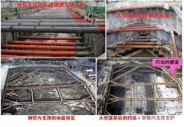 钢管支撑一般采用Φ609钢管,用不同壁厚适应不同的荷载。钢管支撑的形式为对撑或角撑,对撑的间距较大时,可设置腹杆形成桁架式支撑。