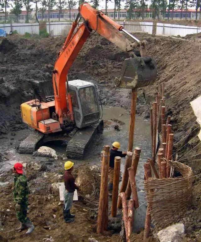 先沿基坑边缘打设柱桩,在柱桩内侧支设挡土板并用斜撑支顶,挡土板内侧填土夯实。适用于深度不大的大型基坑使用。