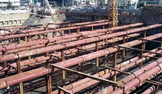 当基坑深度较大,悬臂式挡墙的强度和变形无法满足要求、坑外锚拉可靠性低时,则可在坑内采用内撑支护。它适用于各种地基土层,缺点是内支撑会占用一定的施工空间。常用有钢管内撑支护和钢筋砼构架内撑支护。
