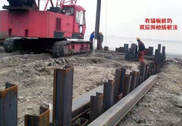 是先沿板桩边线搭设双层围檩支架,然后将板桩依次在双层围檩中全部插好,形成一个高大的板桩墙。待四角封闭合拢后,再按阶梯形逐渐将板桩一块块打至设计标高。该打法可保证平面尺寸准确和板桩垂直度,但施工速度慢。