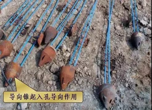 1)造孔:包括钻机就位、施钻成孔、清孔三个作业步骤。造孔用冲击式钻机、旋转式钻机或旋转式冲击钻机,偏心钻机跟进护壁套管方式钻进,造孔须干钻,严禁水钻;考虑沉渣厚度,孔底应超钻30~50mm;成孔后高压风清洗孔壁,以保证砂浆与孔壁的粘结力。