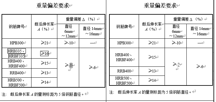 2、钢筋分项:取消HRB335钢筋验收要求,最大总伸长率改为最大力总延长率,钢筋重量偏差作了细微修正。