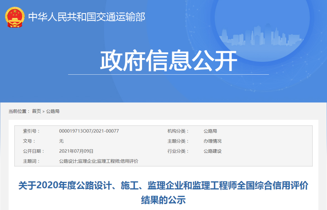 近日,交通运输部发布《关于2020年度公路设计、施工、监理企业和监理工程师全国综合信用评价结果的公示》: