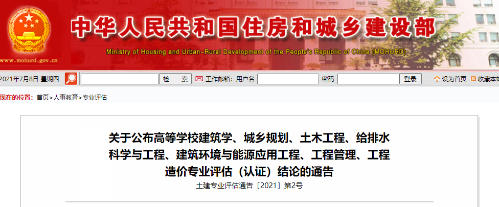 关于公布高等学校建筑学、城乡规划、土木工程、给排水科学与工程、建筑环境与能源应用工程、工程管理、工程造价专业评估(认证)结论的通告