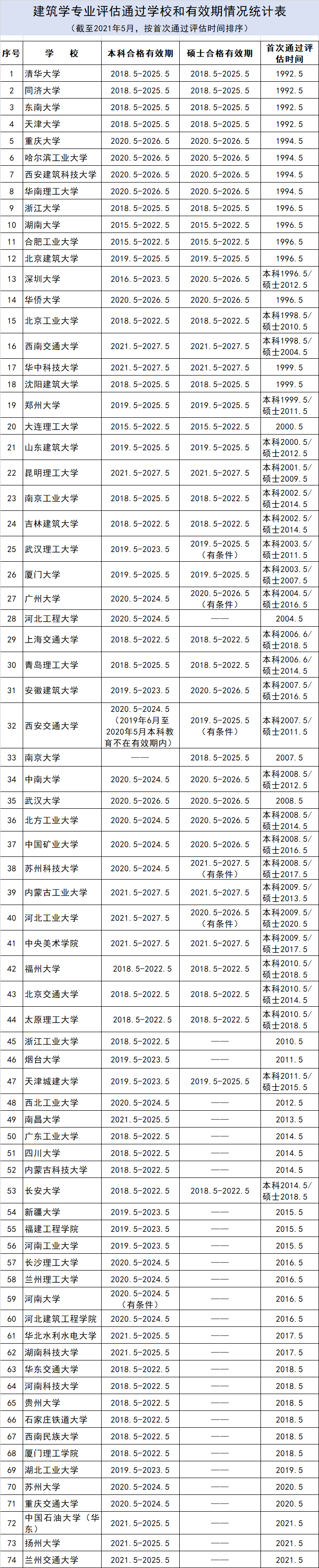 1、 建筑学专业评估通过学校和有效期情况统计表(截至2021年5月,按首次通过评估时间排序)