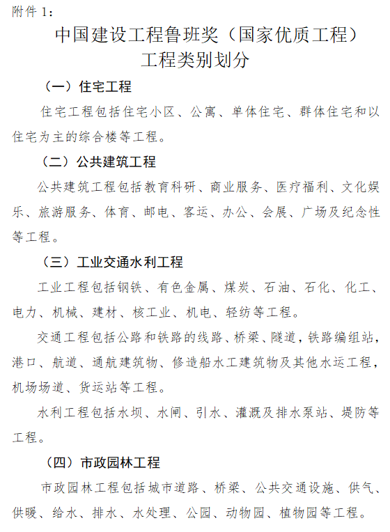 附件:1、中国建设工程鲁班奖(国家优质工程)工程类别划分