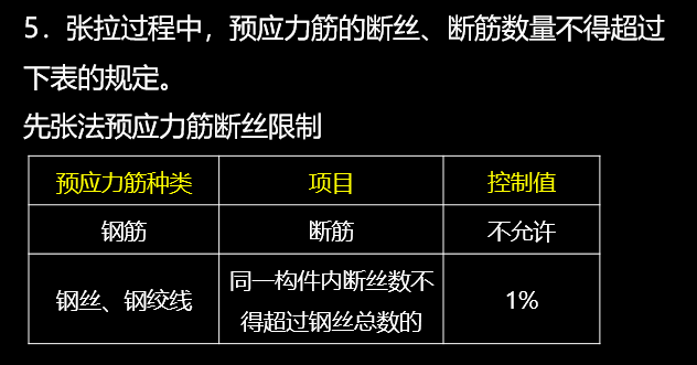 4.张拉施工质量控制应做到“六不张拉”,即;没有预应力筋出厂材料合格证、预应力筋规格不符合设计要求、配套件不符合设计要求、张拉前交底不清、准备工作不充分安全设施未做好、混凝土强度达不到设计要求,不张拉。