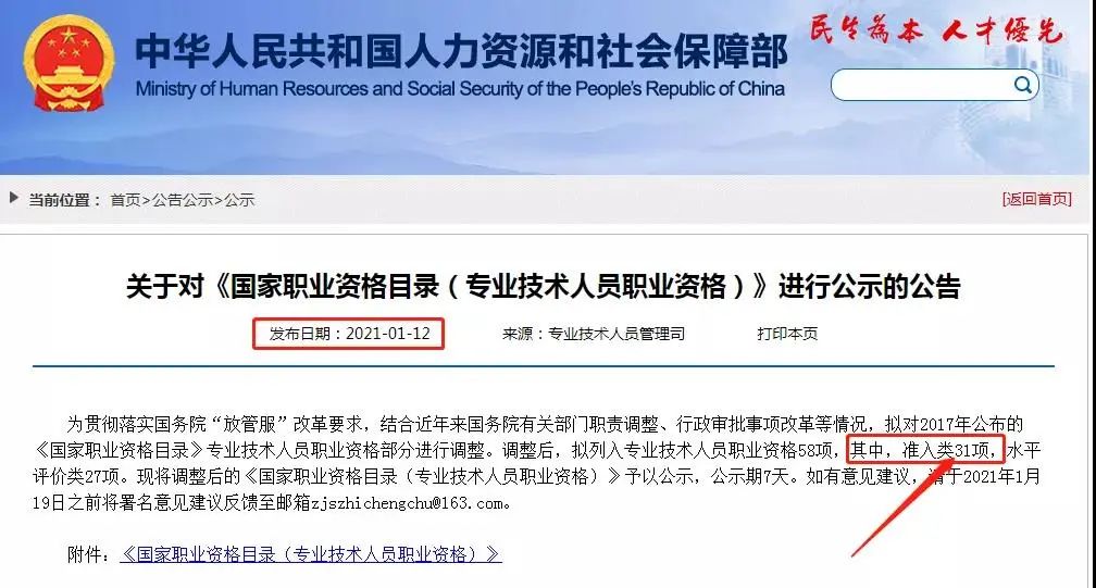 2021年1月12日,人社部对2017年公布的职业资格进行调整并公示,调整后,拟列入专业技术人员职业资格58项,其中准入类31项,水平评价类27项。最新版本如下: