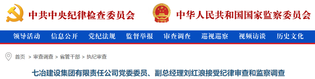 七冶建设集团有限责任公司党委委员、副总经理刘红浪接受纪律审查和监察调查据贵州省纪委监委消息:七冶建设集团有限责任公司党委委员、副总经理刘红浪涉嫌严重违纪违法,目前正接受贵州省纪委监委纪律审查和监察调查。