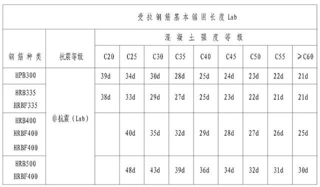 非抗震结构所有构件;抗震结构的L梁(次梁)、XL梁(挑梁)、JZL(井字梁)、板内受拉钢筋的最小锚固长度及最小搭接长度(Ll)的基数(搭接100%:1.6 La;搭接50%:1.4 La;搭接25%:1.2 La)。