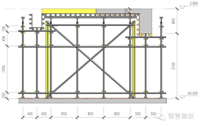 这个图片看得比较清楚,水平杆是分开的,而且是错开设置的。后浇带设置独立的剪刀撑,梁板模板剪刀撑单独设置,拆模时,将灰色支撑拆掉,保留黄色支撑就可以了!