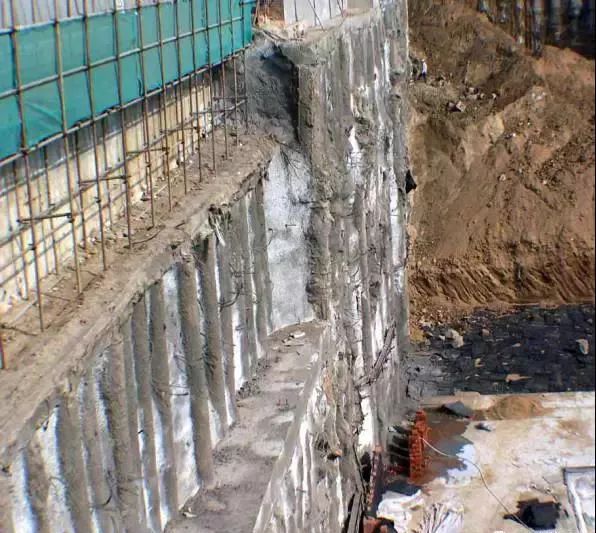 先建造钢筋砼地下连续墙,达到强度后在墙间用机械挖土。该支护法刚度大、强度高,可挡土、承重、截水、抗渗,可在狭窄场地施工,适于大面积、有地下水的深基坑施工。