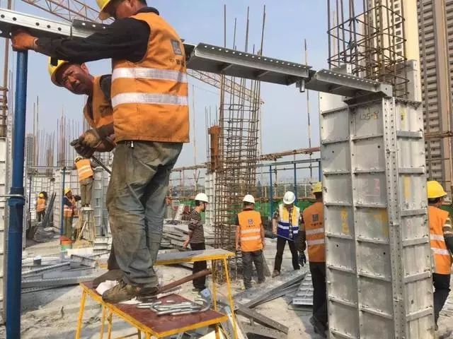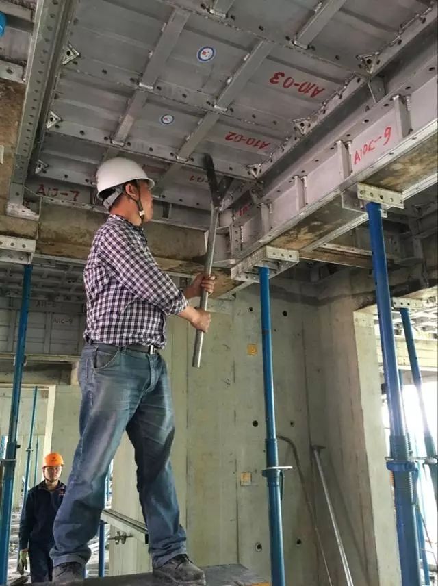 楼面对角线检查无误时,开始安装楼面模板,为了安装快捷,楼面模板要平行逐件排放,先用销子临时固定,最后统一打紧销子。